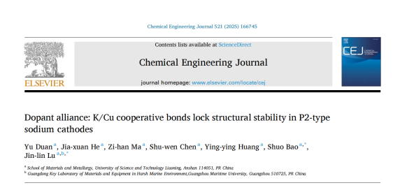 近日,FH体育(国际)官方网站材料与冶金学院包硕副教授联合广州航海学院(广州交通大学筹)路金林教授,以FH体育(国际)官方网站为第一署名单位,在国际知名期刊《Chemical Engineering Journal》(中科院1区top期刊,2025年影响因子:13.2)发表高水平研究论文《Dopant alliance: K/Cu cooperative bonds lock structural stability in P2-type sodium cathodes》(https://doi.org/10.1016/j.cej.2025.166745),第一作者为FH SPORTS2023级硕士研究生段玉。
