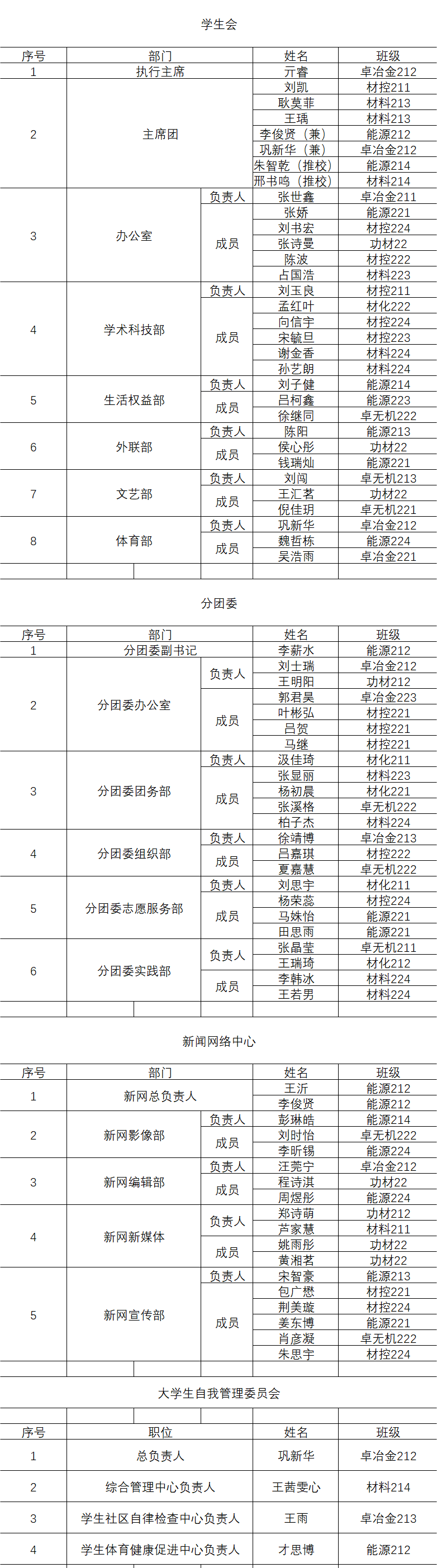 为进一步加强学院学生管理工作建设、增强学生组织的凝聚力和向心力、督促学生自我勉励、创造更好的学院氛围,拟定亓睿等77名同学为FH体育(国际)官方网站材料与冶金学院第十四届团委、学生会、新闻网络中心、自我管理委员会成员。