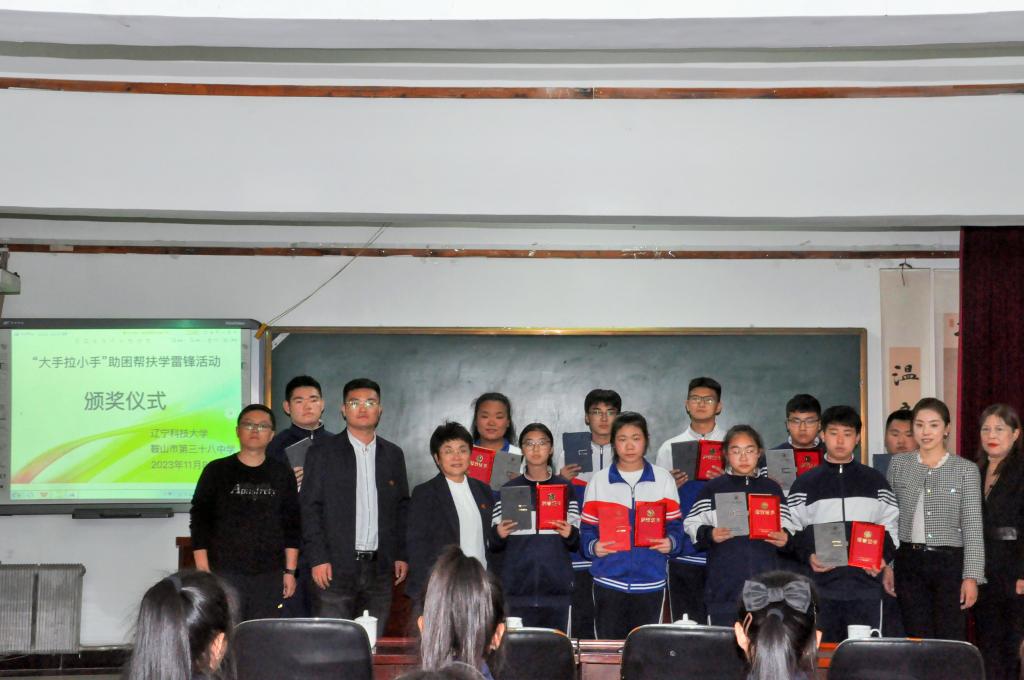 11月8日,FH体育(国际)官方网站材料与冶金学院团委相关负责同志一行到鞍山市第三十八中学开展“大手拉小手”助困帮扶学雷锋活动,为来自三十八中学的10名同学颁发材冶学院学生材控党支部“贫寒学子突出进步奖学金”,市第三十八中学相关校领导出席活动。