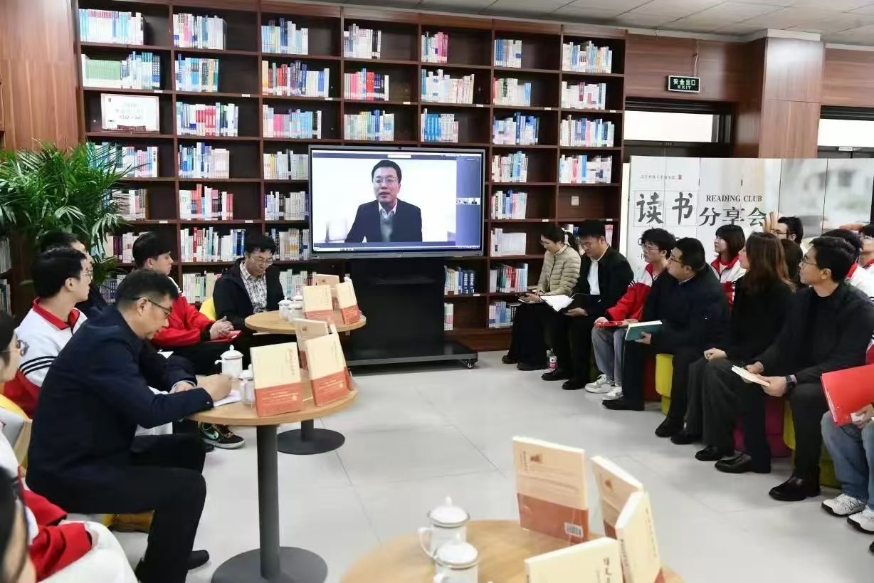 1127日下午,FH体育(国际)官方网站“顶天立地谈信仰”主题读书会暨为大学生上思想政治理论课活动在学校图书馆经典阅读空间举办,学校党委书记孟劲松走进对接班级材料与冶金学院冶金工程2021-2班开展读书分享,学校党政办公室、党委学生工作部、图书馆负责人,材料与冶金学院班子成员、全体辅导员、冶金工程专业2021-2班全体学生参加读书会,《顶天立地谈信仰——原来党课可以这么上》书作者,十九大、二十大代表,南京航空航天大学博士生导师、教授徐川受邀线上参加活动。