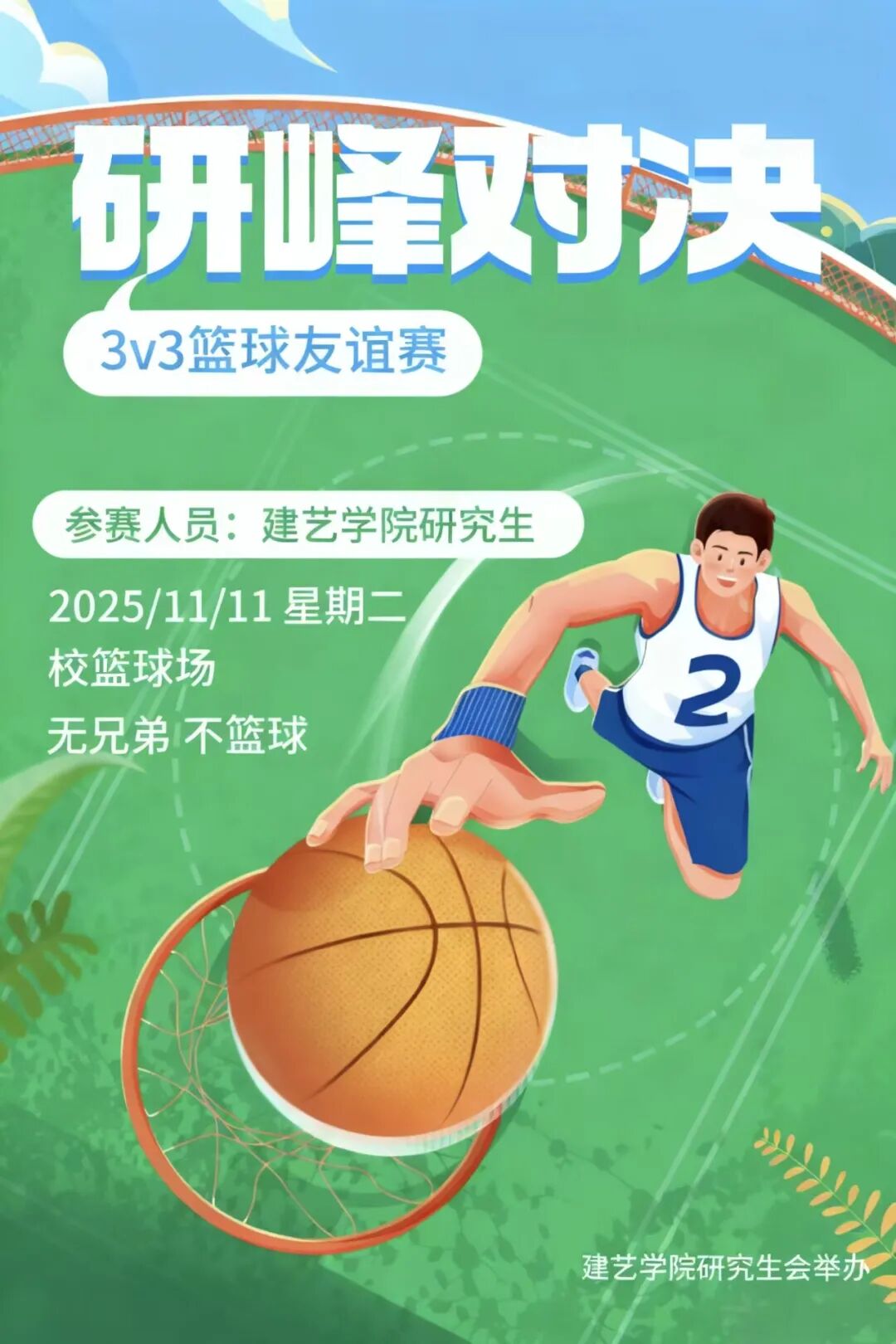 为促进学院2024级与2025级研究生之间的交流与融合,丰富校园文化生活,11月11日,建艺学院于室外篮球场成功举办“研峰对决”篮球赛,吸引众多研究生积极参与。