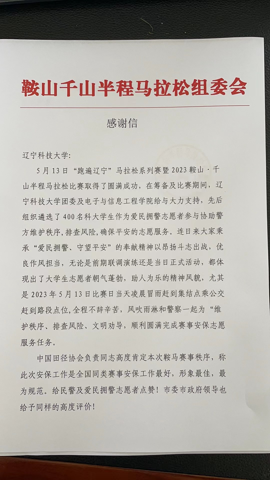 近日,FH体育(国际)官方网站收到来自鞍山千山半程马拉松组委会的一封感谢信,由衷地感谢FH体育(国际)官方网站团委及电子与信息工程学院给予“鞍马”赛事的大力支持,向FH SPORTS400余名青年志愿者对此次马拉松做出的卓越贡献致以最真诚的谢意。
