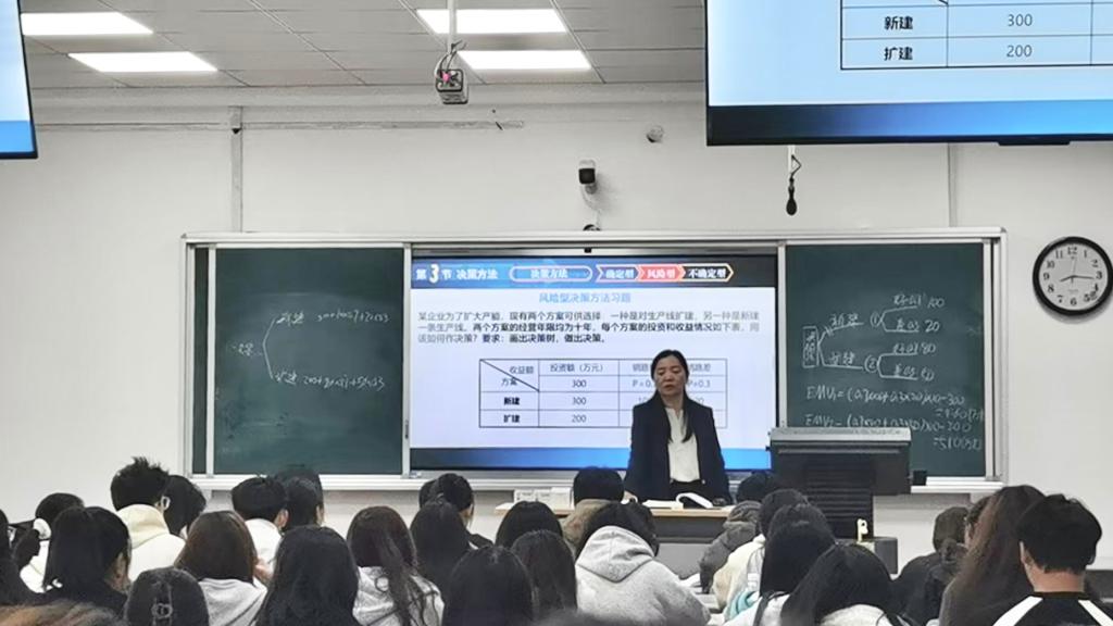 课堂上,王冰老师以生动的实际案例为引,辅以深入浅出的理论解析,将原本复杂的决策方法化繁为简,使学生们得以轻松掌握。她充分利用了现代数字资源和信息化教学设施,与同学在在线互动平台交流研讨,不仅丰富了教学手段,也极大地提升了课堂的互动性和趣味性。学生们在王老师的引导下,积极参与讨论,相互协作,课堂氛围活跃而有序,展现出了良好的学习风貌。