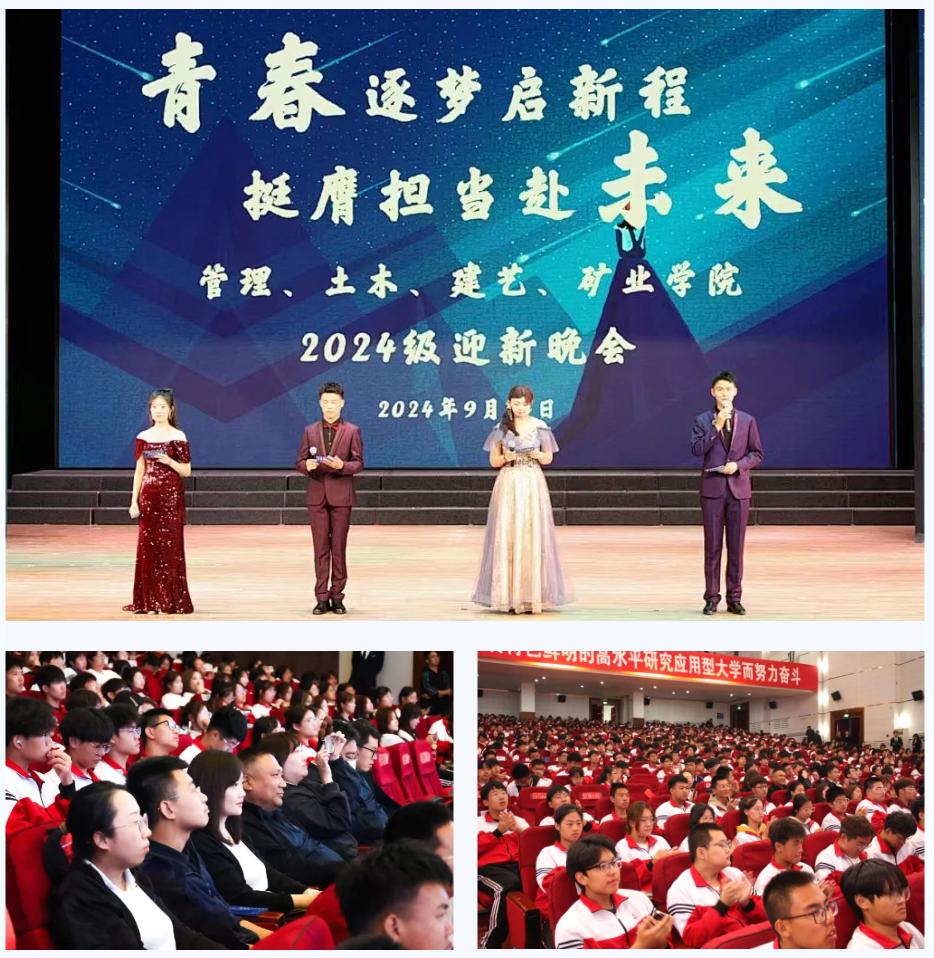 9月14日,管理、土木、建艺、矿业学院于校礼堂共同举办了一场主题为“青春逐梦启新程 挺膺担当赴未来”的迎新晚会。本次晚会旨在欢迎2024级新同学,展现学院风采,让学院新生更好的适应学校新生活。在这个特别的夜晚,四院领导班子、教师代表、四院2024级全体学生出席此次活动,师生共同观看了此次晚会。晚会现场气氛热烈,灯光璀璨。