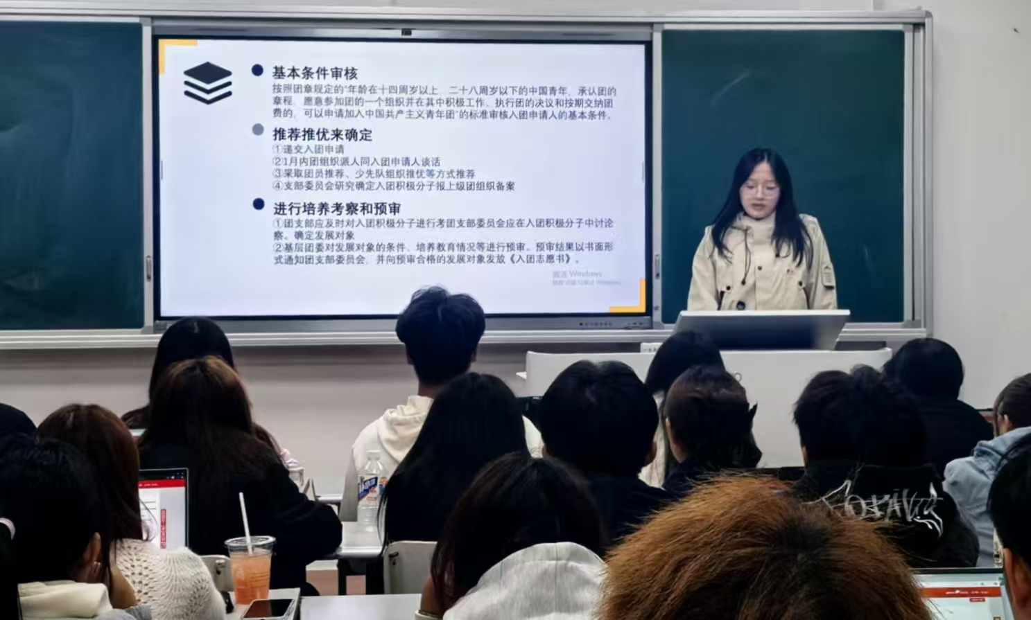 第二项内容由团务办公室负责人刘雨竹主讲,主题为团务工作实务,旨在帮助新生团干部系统掌握团务工作核心要点与实操方法。她围绕团务工作关键环节展开讲解,在团组织建设方面,明确支部班子搭建、换届选举流程及组织生活制度落实的规范要求,强调需结合实际优化组织架构,增强凝聚力;围绕团员日常管理,她详细说明了团员发展全流程、信息档案规范及团组织关系转接要点,特别提醒要做好流动团员跟踪管理以防“失联”。