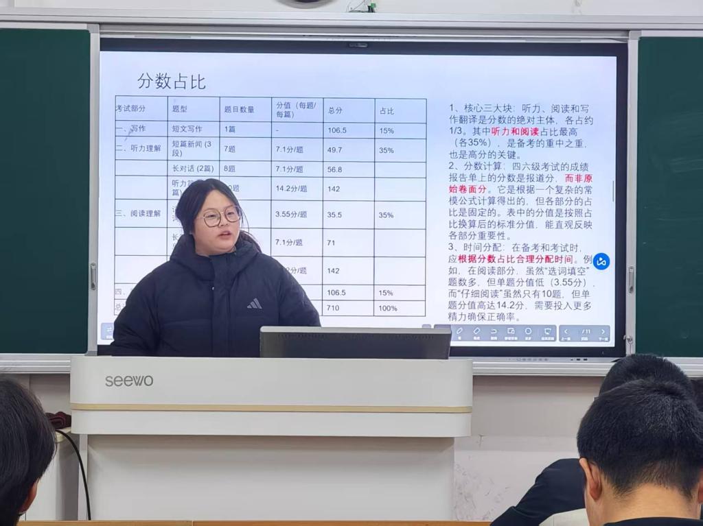 金思瑶通过“分数地图”“风向标”“备考蓝图”三大板块,为同学们梳理出清晰的四级备考路径。首先她通过“分数地图”介绍四级考试的分数占比和时间分配。她指出,听力与阅读是提分关键。在“风向标”板块,金思瑶分析了近年四级考试的命题趋势。随后,她在“备考蓝图”板块,提示同学们要打好语言基础,努力攻克词汇积累与语感培养两大核心难题。金思瑶寄语在场学子:“愿你们在这四年里,既积累知识的厚度,也拓展生命的广度;既打磨专业的锋芒,也守护心灵的柔软。让每一个日子都成为精雕细刻的典藏版。