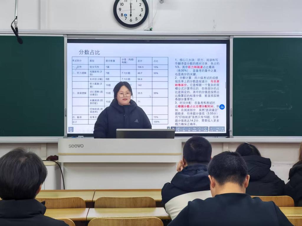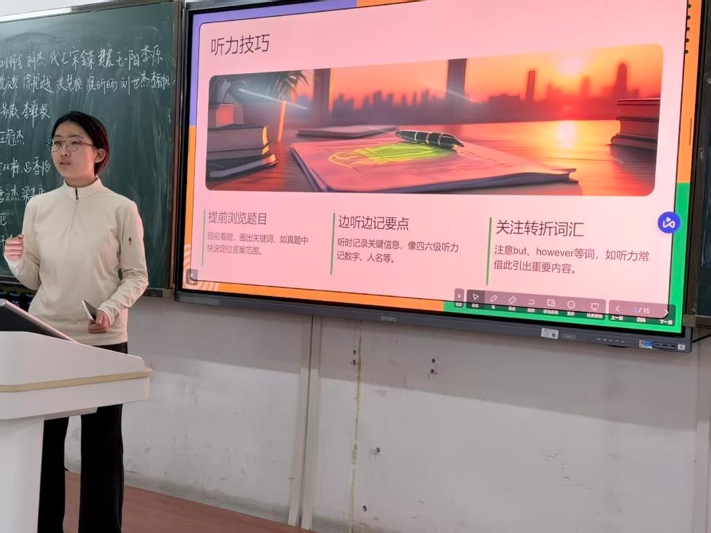 曹婧哲结合自身高分通过四级考试的经验,系统梳理了四级试卷中听力、段落匹配和仔细阅读三部分的应试技巧。她重点分析了听力题型和听力技巧,强调“提前浏览题目、边听边记要点”等技巧在听力答题中的重要性。阅读部分,她重点分享了“关键词定位法”等高效阅读方法,帮助同学们提升段落匹配与仔细阅读的准确率。同时,曹婧哲还通过展示自己的四级成绩报告单,鼓励同学们树立信心,勇敢面对四级考试的挑战。