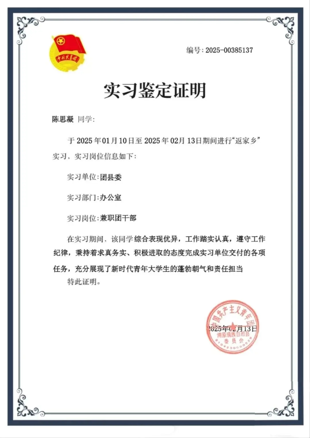 陈思凝,女,共青团员,工商241班班长。寒假期间她积极投身“返家乡”社会实践活动,在中国共产主义青年团清原满族自治县委员会进行了为期一个月的志愿服务。