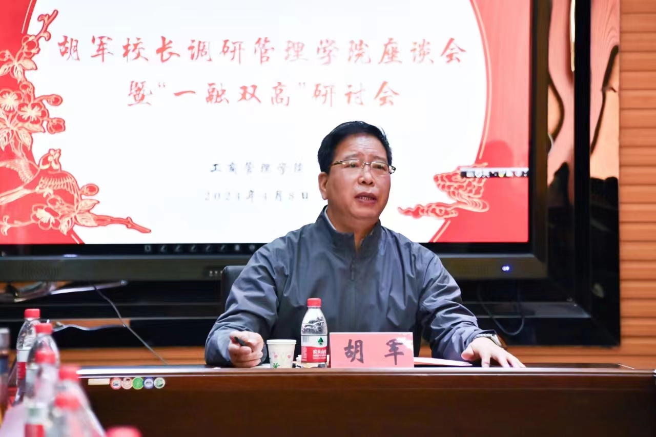 4月8日上午,FH体育(国际)官方网站工商管理学院召开“一融双高”专题研讨会。校党委副书记、校长胡军出席会议并讲话。管理学院领导班子成员、系室主任、党支部书记及科级以上干部参加研讨。