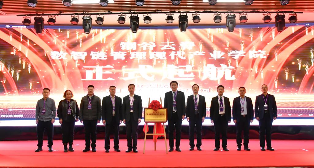 激动人心的启航时刻将现场氛围推向全新高潮。副校长张文宇教授代表学校庄严宣读产业学院第一届行政机构与监事会成员名单,并向受聘人员颁发了承载着信任与责任的聘任证书。工商管理学院院长金玉然为五家合作企业设立的“驻校工作站”授牌,标志着产业资源与专业智慧深度融入校园育人体系的常态化实体平台正式落成。在全体与会嘉宾的共同见证下,校企双方代表携手为“钢谷云脊数智链管理现代产业学院”隆重揭牌,产业学院自此正式扬帆起航。这一刻,不仅定格了一个全新育人实体的诞生,更象征着一段校企携手共创未来的征程正式开启。
