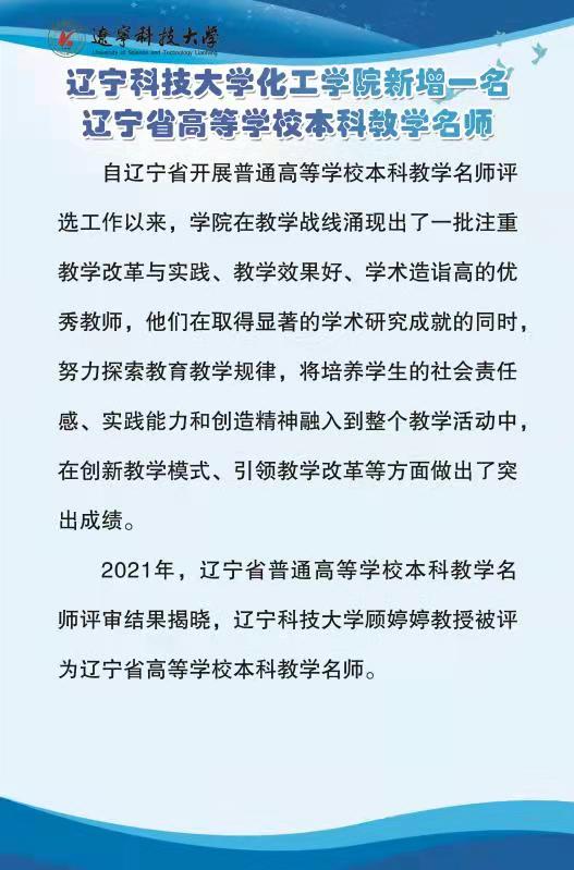 FH体育(国际)官方网站化工学院新增一名辽宁省高等学校本科教学名师