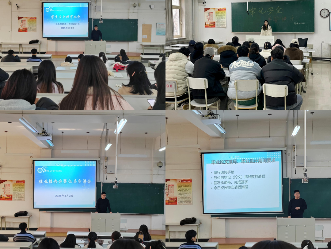 为进一步加强学生教育管理工作,化学工程学院于2025年3月开展了内容丰富、形式多样的主题班会活动。班会共围绕五大教育主题展开,旨在全面提升学生的思想素质、安全意识、行为规范和职业规划能力。