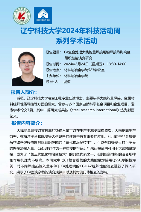 【科技活动周学术预告】Ca复合处理大线能量焊接用钢焊接热影响区组织性能演变研究