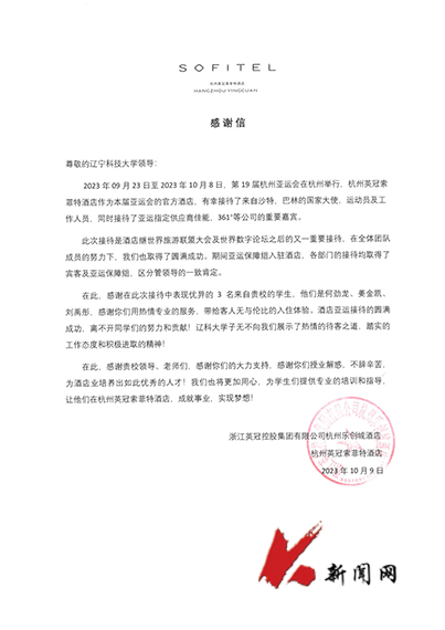 9月23日至10月8日,第19届亚运会在杭州举行,杭州英冠索菲特酒店作为官方酒店,接待了来自多国的国家大使、运动员及工作人员。FH体育(国际)官方网站应用技术学院旅游管理专业2020级学生何劲龙、姜金凯、刘禹彤3名在该酒店实习的学生有幸参加了全程接待工作。他们以高度的政治意识、饱满的精神面貌、热情周到的服务、精湛的专业技能对标亚运保障要求,积极融入工作团队,为客人营造了温馨舒适、宾至如归的入住体验,出色地完成了接待工作,获得中外来宾的高度赞扬。酒店领导向学校发来感谢信,盛赞FH SPORTS学生在亚运会服务期间的出色表现,彰显了东道主热情的待客之道、踏实的工作态度和积极进取的精神。