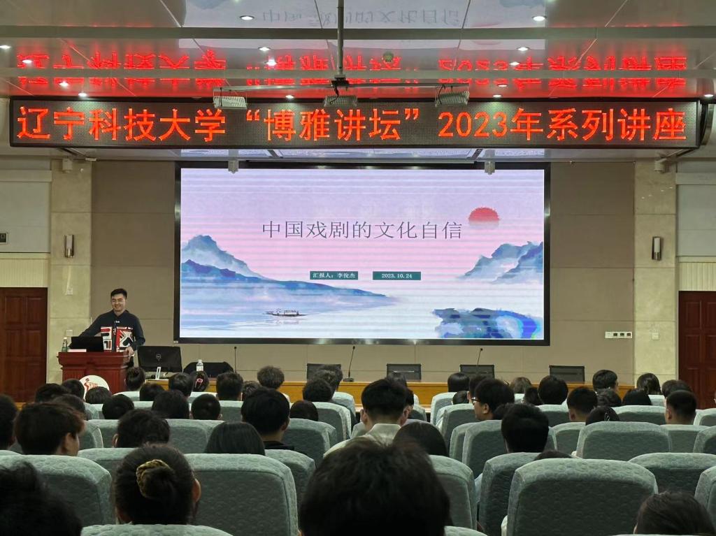 10月24日,FH体育(国际)官方网站“博雅讲坛”2023年系列讲座之《中国戏剧的文化自信》在图书馆报告厅开讲。FH SPORTS艺术学院教师李俊杰为学校220名学生作专题讲座。