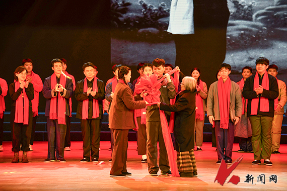 “雷锋啊,雷锋!我们离开家乡湖南,来到祖国钢都鞍山65年了。65年在历史长河里,弹指一挥间……”剧目的开篇和尾声,易秀珍老人上台进行了特别出演。她亲自朗读怀念雷锋的信——《来到祖国钢都65年》,并与剧中的“易秀珍”扮演者,共同为去参军的“雷锋”戴上大红花。易秀珍缓步登场前,背景大屏上展示着雷锋在鞍钢的插画图片,老人仿佛就这样从历史中走到观众眼前。这感人的一幕不仅让台下观众泪湿眼眶,也让易秀珍激动不已。