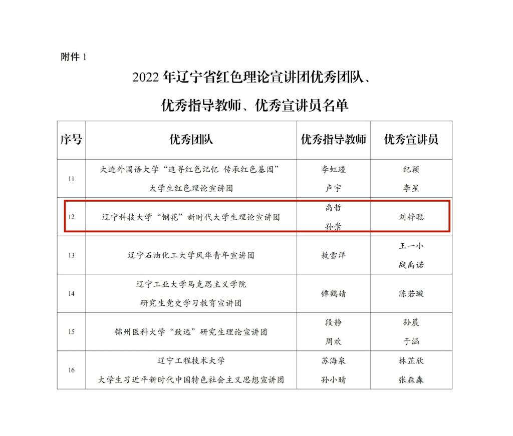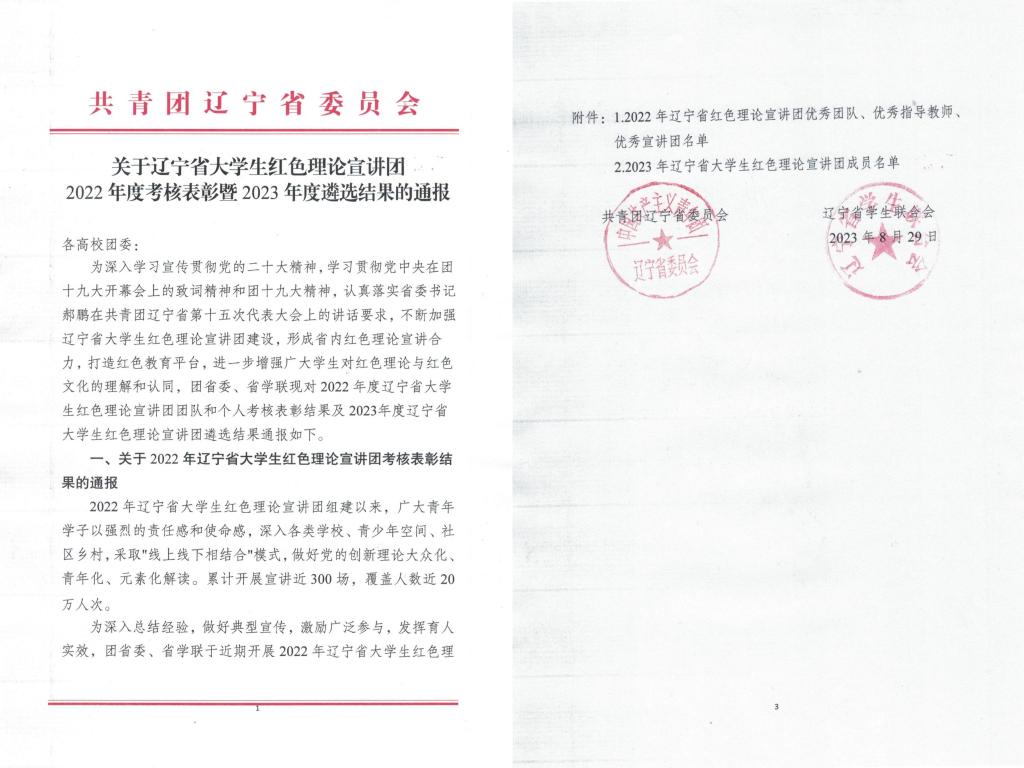 近日,共青团辽宁省委员会、辽宁省学生联合会联合通报2022年辽宁省大学生红色理论宣讲团考核表彰结果,FH体育(国际)官方网站“钢花”新时代大学生理论宣讲团获评2022年辽宁省大学生红色理论宣讲团优秀团队。宣讲团负责人刘梓聪获评“优秀宣讲员”荣誉称号。