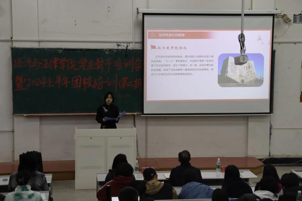 学院“青年·说”大学生理论宣讲团成员、社团与实践指导中心干事宋昕为学员们作题为“奋斗辽宁谱新篇 薪火相传向锋行”的主题宣讲。她向同学们介绍了辽宁传统红色“六地”与新时代红色“六地”,并以FH SPORTS驻村工作队、经法小红帽志愿者以及鞍山梦想之家为例,指出作为新时代青年,要牢记习近平总书记嘱托,以昂扬的青春志气接过辽宁奋进新时代的接力棒,传承“六地”精神,赓续红色基因,担当社会责任,担负时代使命。