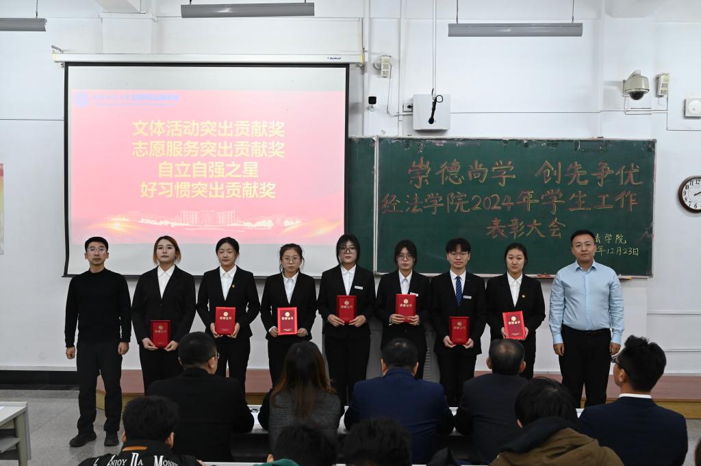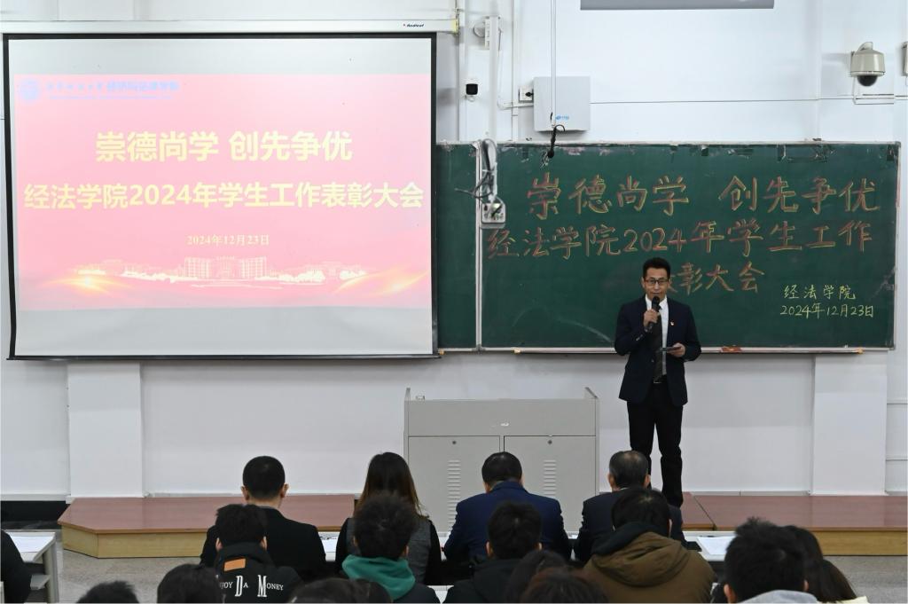 12月23日,经法学院于博学楼A101召开“崇德尚学 创先争优”2024年学生工作表彰大会。会议由学院党委书记赵智博主持,学院领导、各系主任、班主任、辅导员、获奖学生代表及2024级全体学生参加。