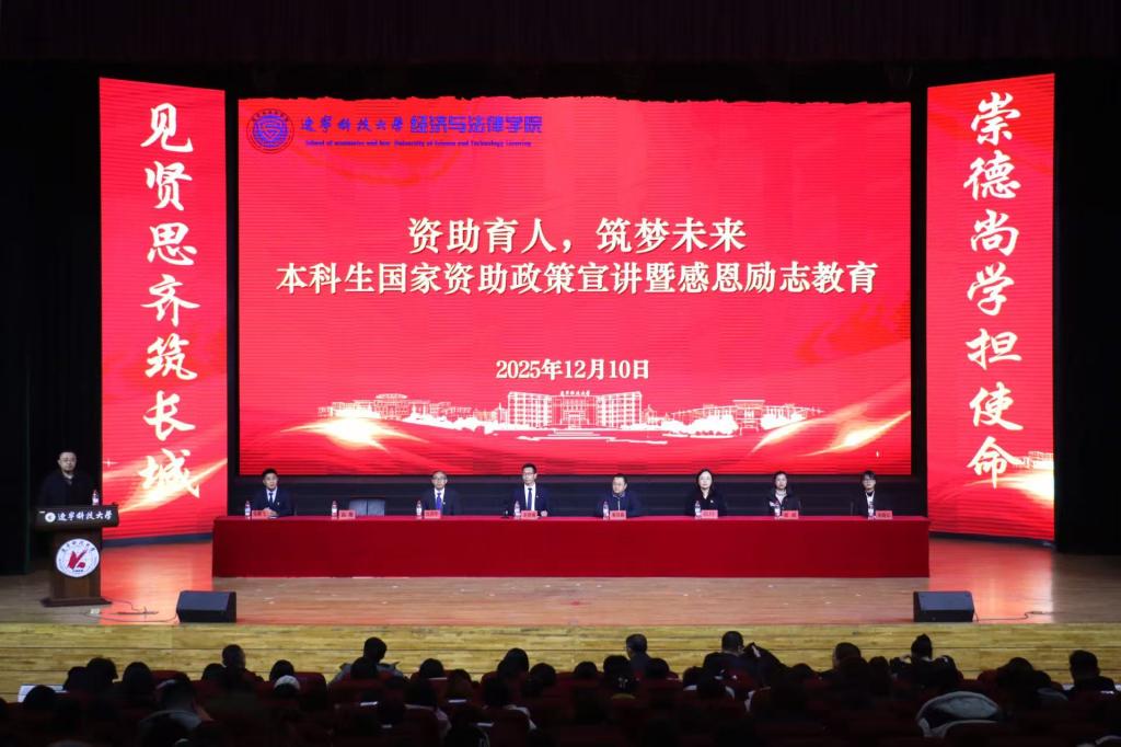 12月10日,经法学院在校礼堂隆重举行2025年度学生工作表彰大会。会议由经法学院党委书记赵智博主持,院长郭浩淼、党委副书记张国华、副院长邵玲、副院长温馨、金融科技系主任郭威、学办主任李路云、团委书记张鹏飞及2023、2024、2025级全体学生参加。