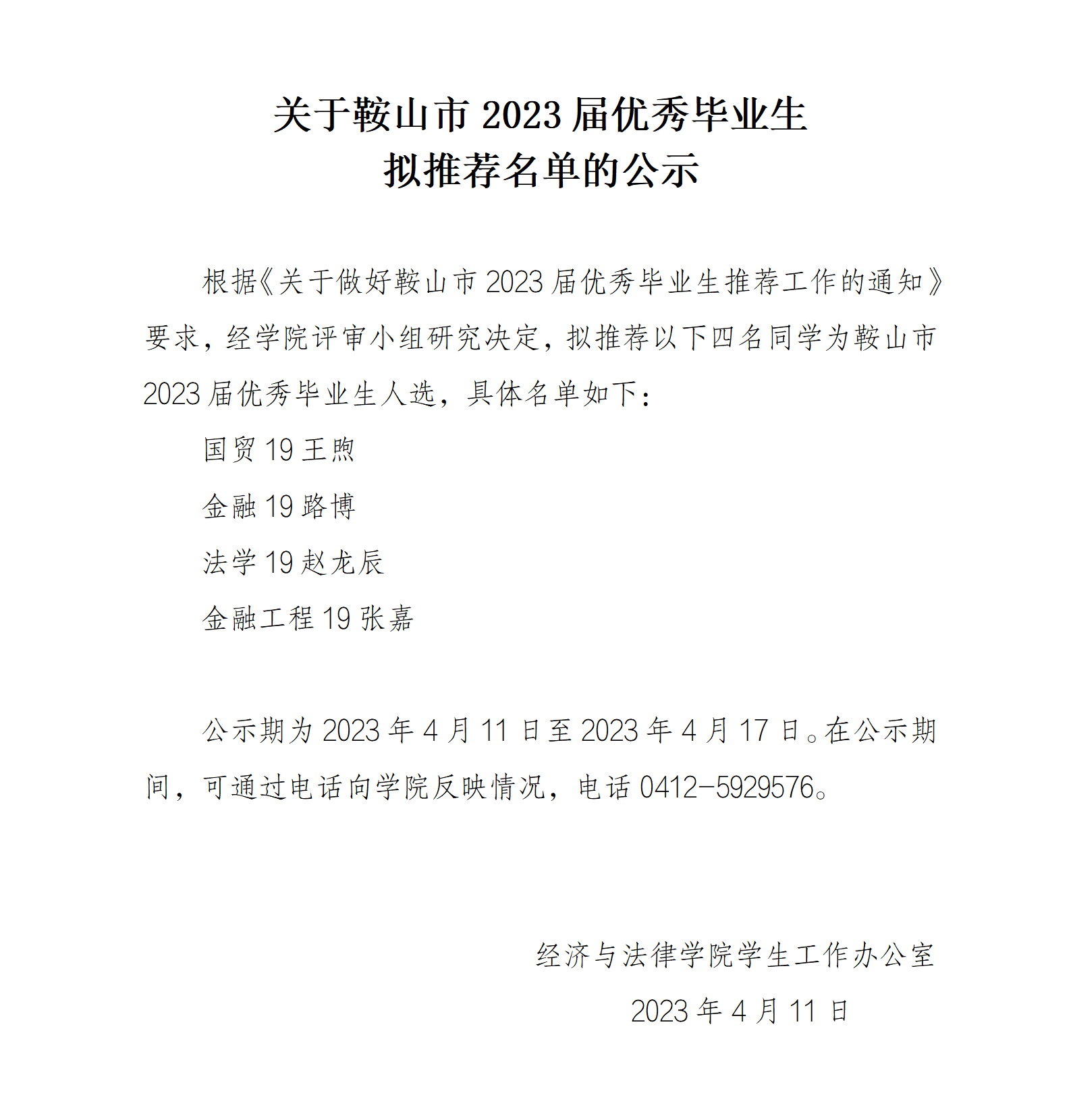关于鞍山市2023届优秀毕业生拟推荐名单的公示