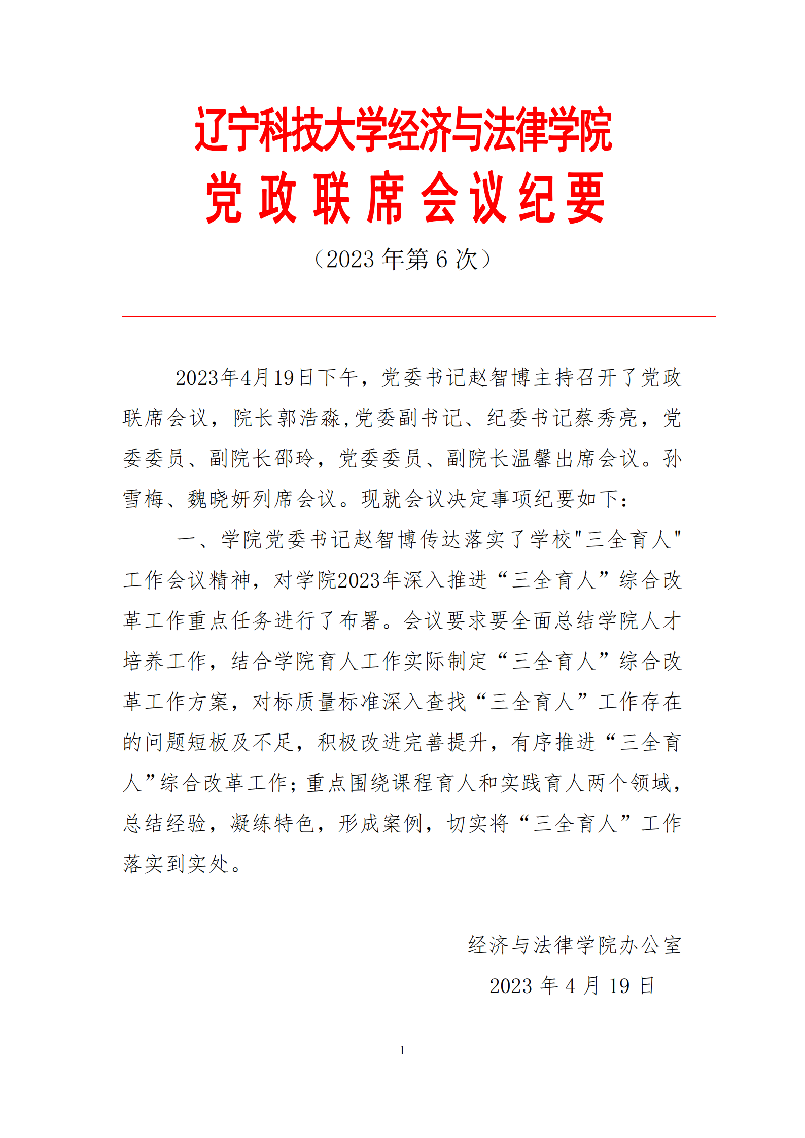FH体育(国际)官方网站经济与法律学院党政联席会会议纪要(2023年第6次)