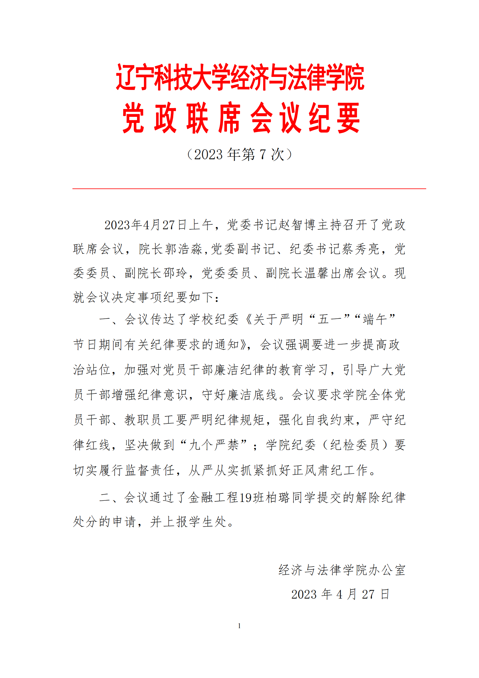 FH体育(国际)官方网站经济与法律学院党政联席会会议纪要(2023年第7次)