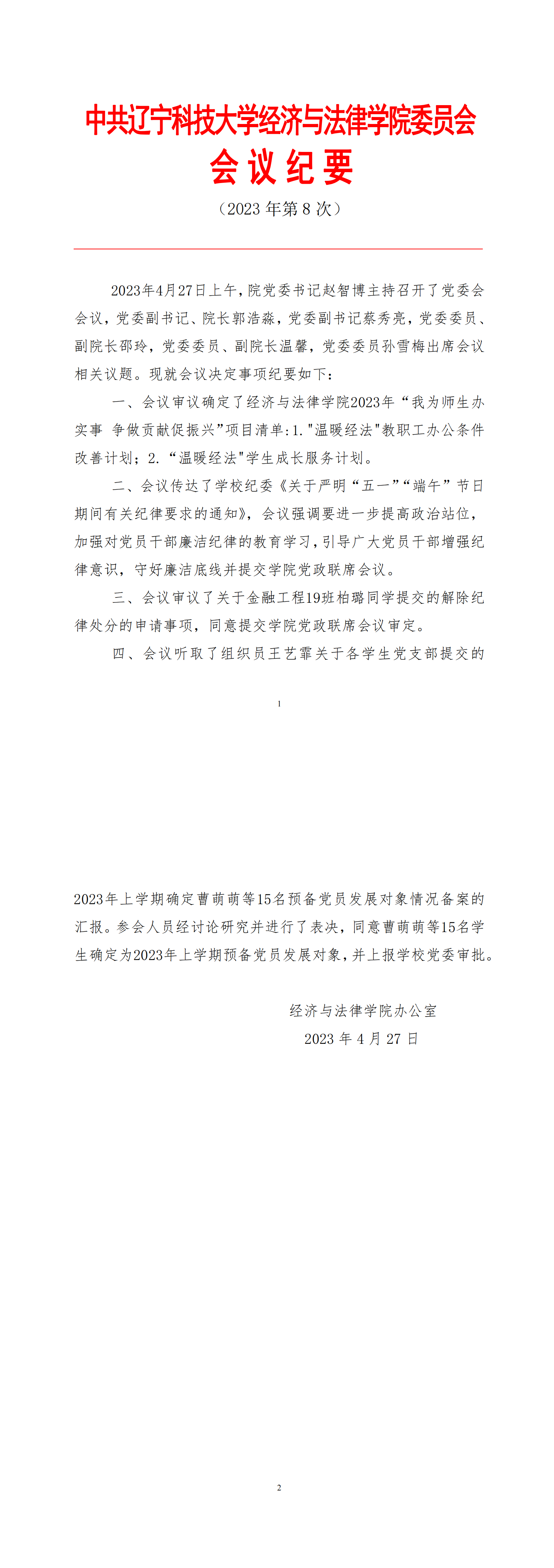 中共FH体育(国际)官方网站经济与法律学院委员会会议纪要(2023年第8次)