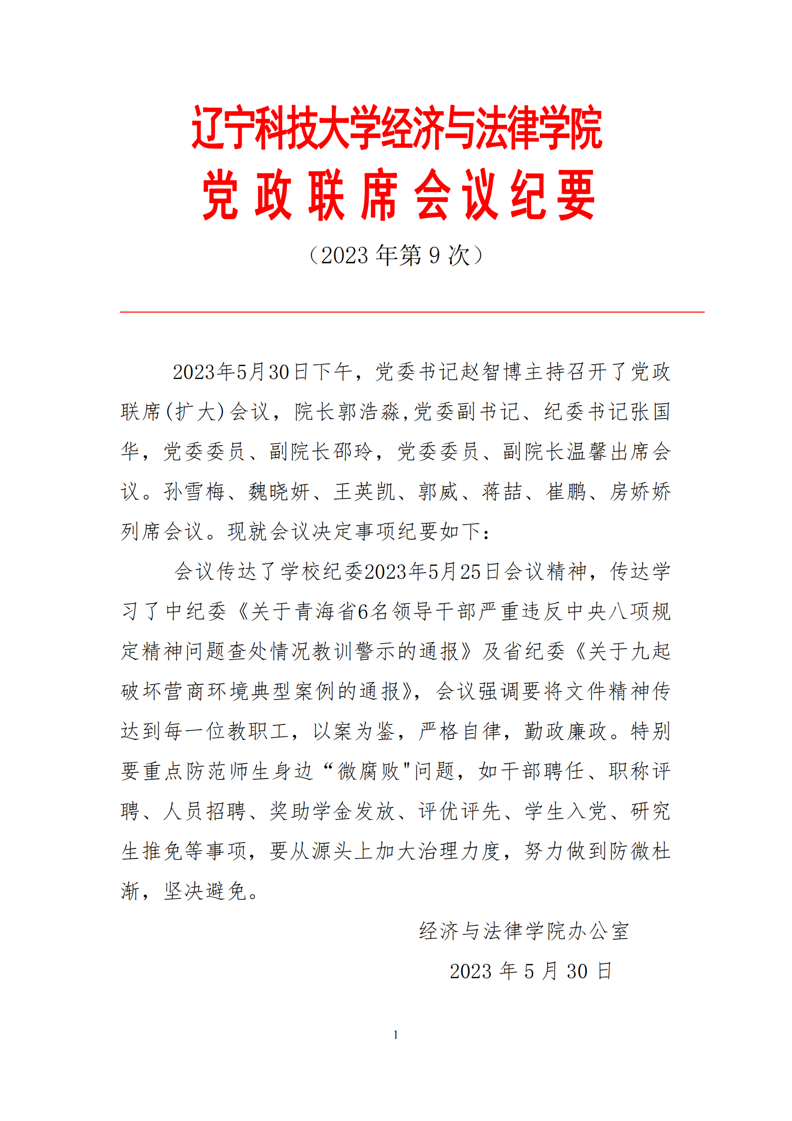 FH体育(国际)官方网站经济与法律学院党政联席会议纪要(2023年第9次)