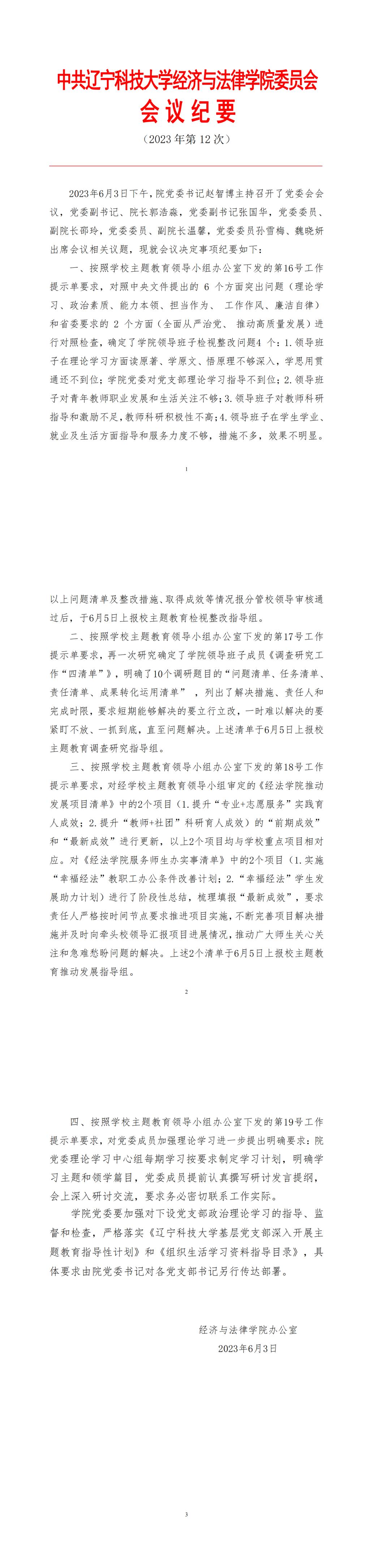 中共FH体育(国际)官方网站经济与法律学院委员会会议纪要(2023年第12次)