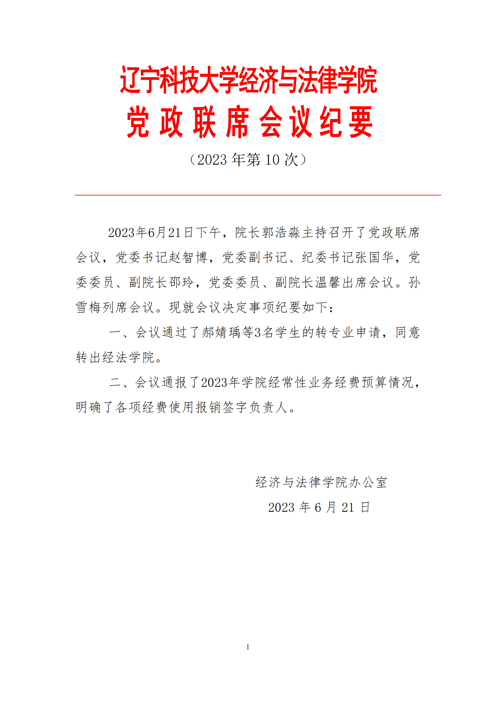 FH体育(国际)官方网站经济与法律学院党政联席会会议纪要(2023年第10次)