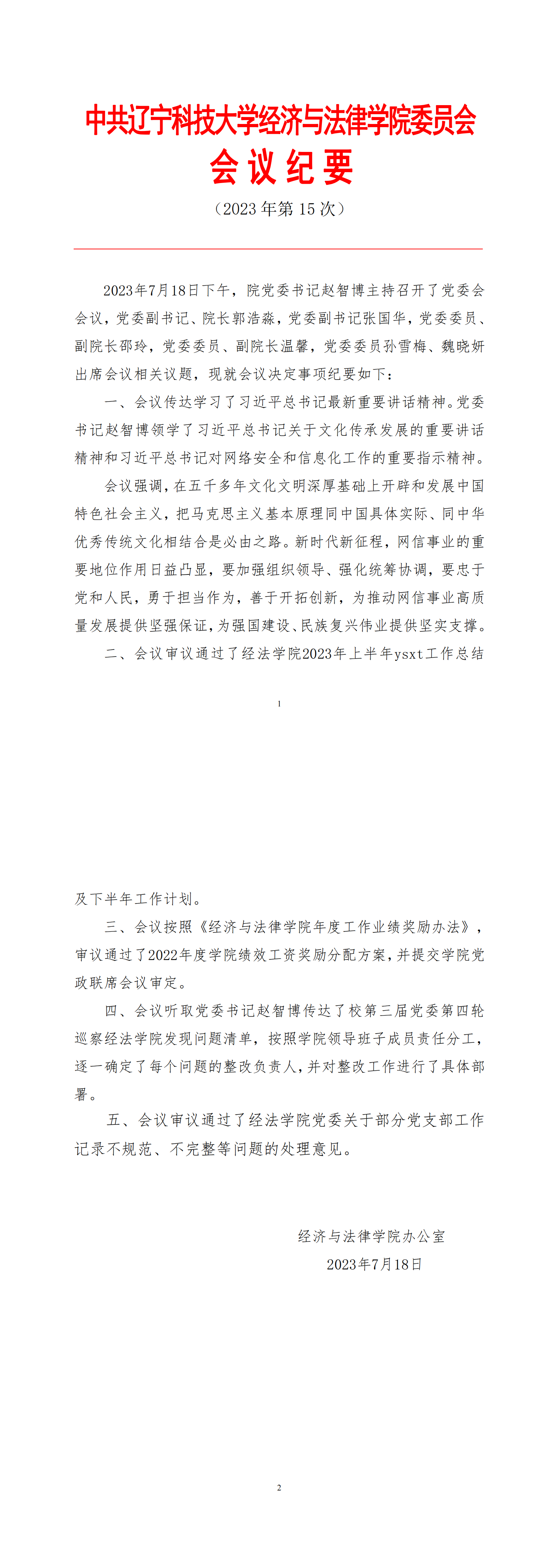 中共FH体育(国际)官方网站经济与法律学院委员会会议纪要(2023年第15次)