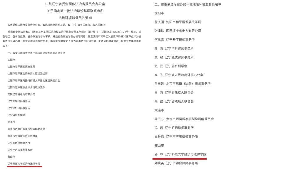近日,辽宁省司法厅发布《中共辽宁省委全面依法治省委员会办公室关于确定第一批法治建设基层联系点和法治环境监督员的通知》,FH体育(国际)官方网站经济与法律学院被确定为省委依法治省办第一批法治建设基层联系点,副院长邵玲被确定为省委依法治省办第一批法治环境监督员。