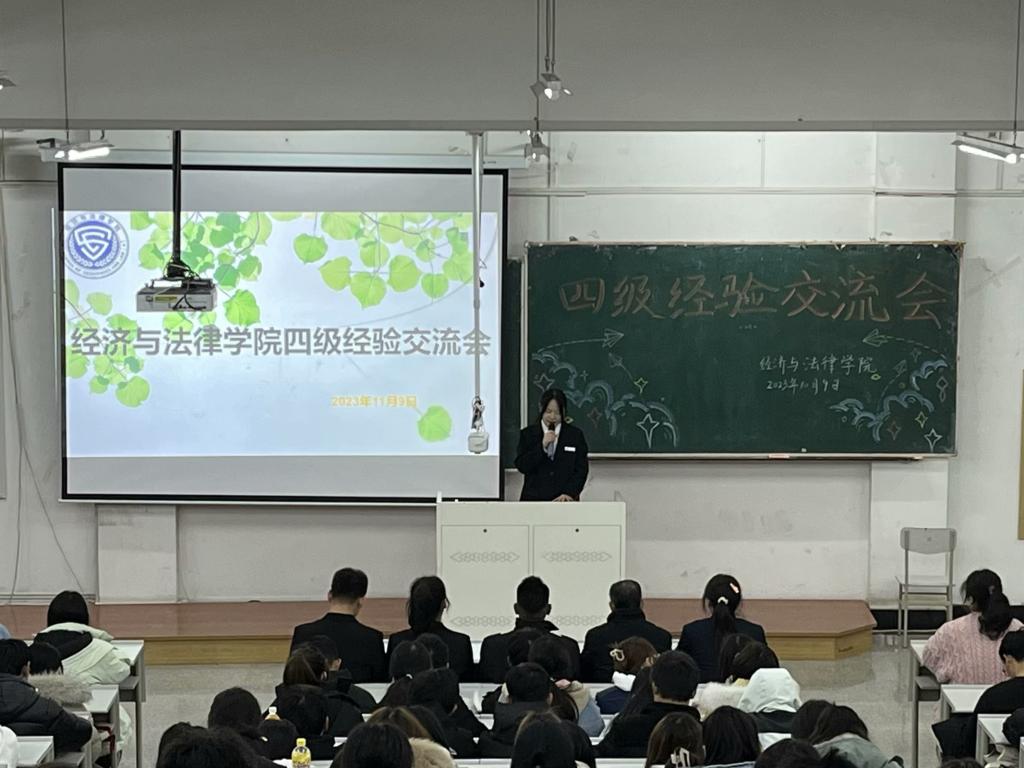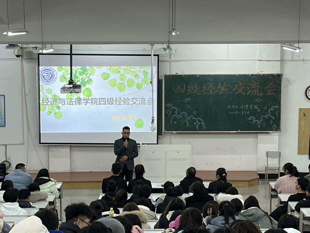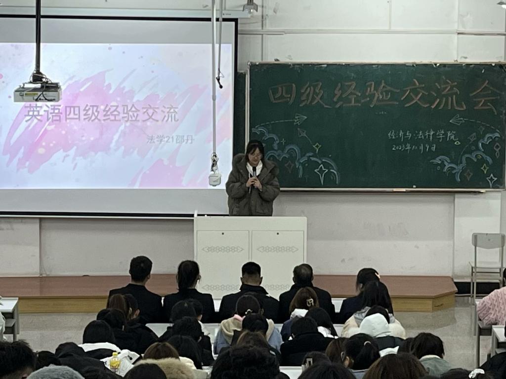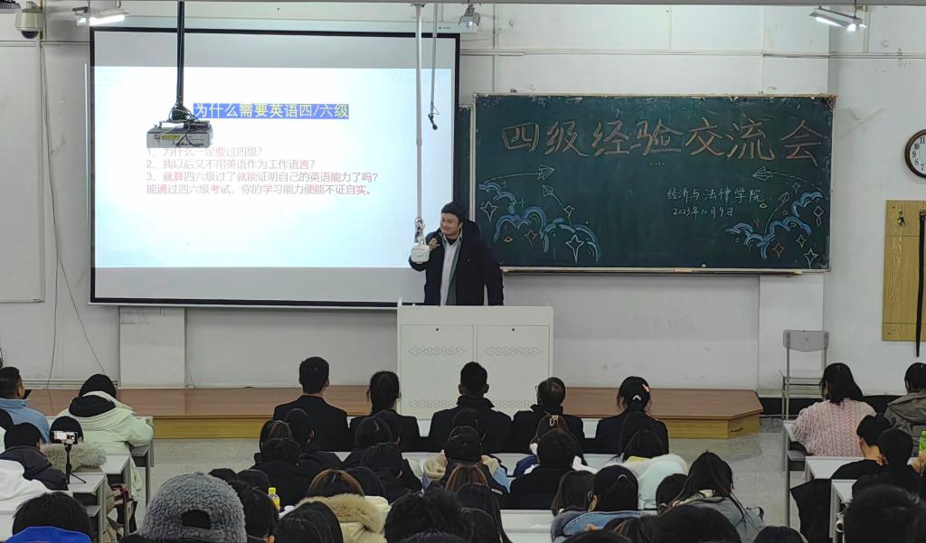 11月9日,经法学院于博学楼C102举办“三比一促一传承”系列活动之英语四级经验交流会。本次会议由学生会学术科技部工作人员刘营萍主持,学院党委书记赵智博、党委副书记张国华、团学骨干以及各年级学生共计280余人参加会议。