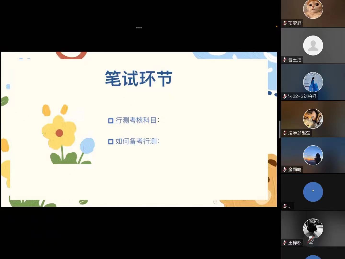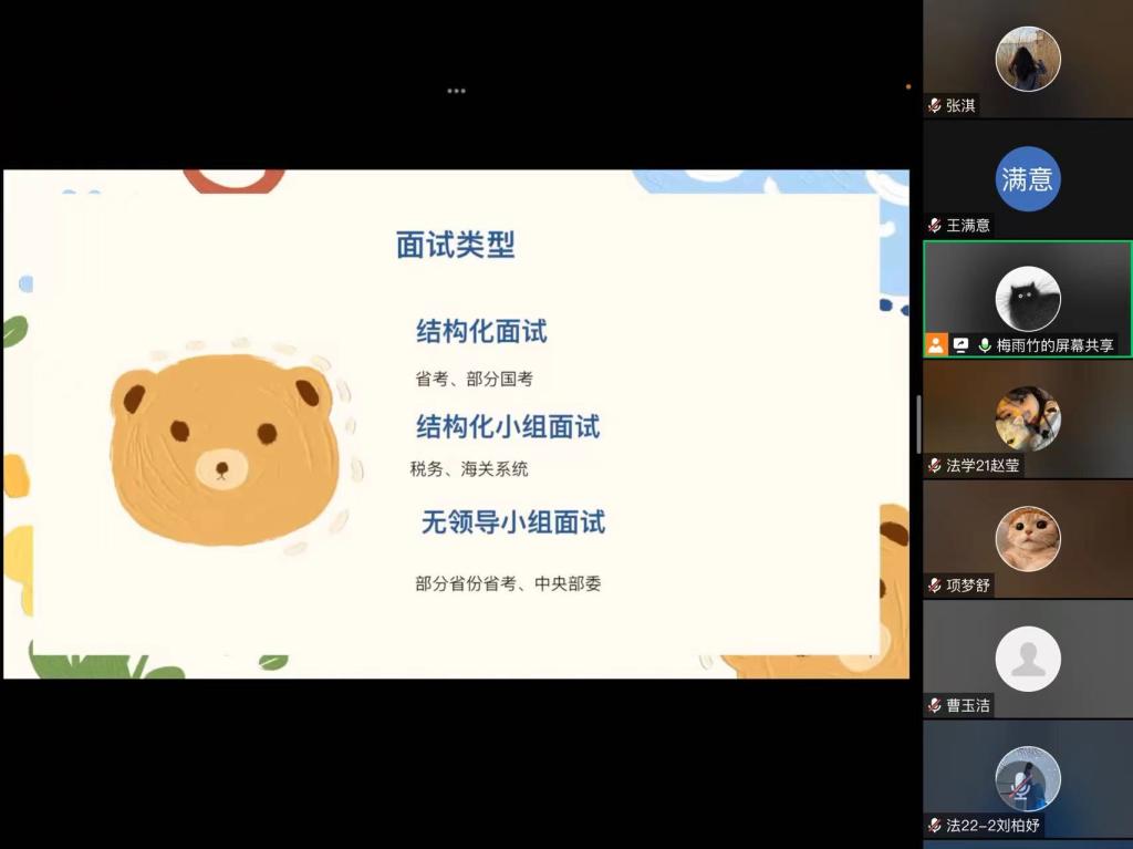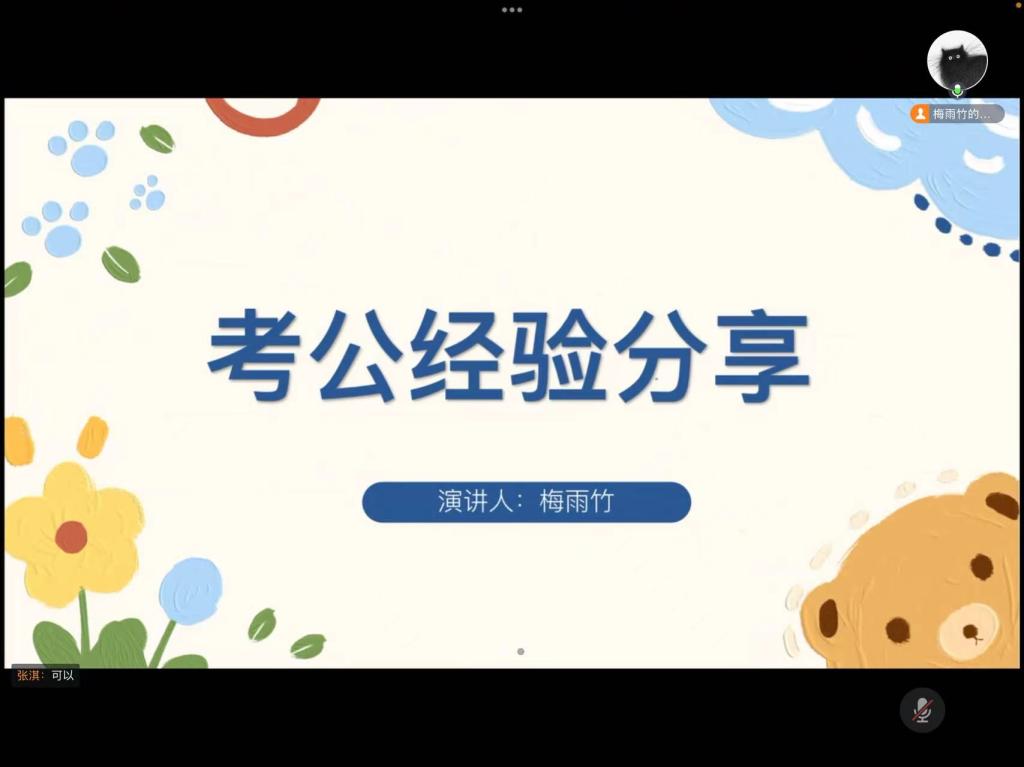 为帮助法律硕士研究生更好地了解公务员考试,进一步明确自身职业规划,5月28日,经法学院于线上召开“逐梦之路 助你成‘公’”考公经验分享会。本次分享会邀请了法硕21梅雨竹同学进行交流分享,2023级全体法律硕士研究生参会。