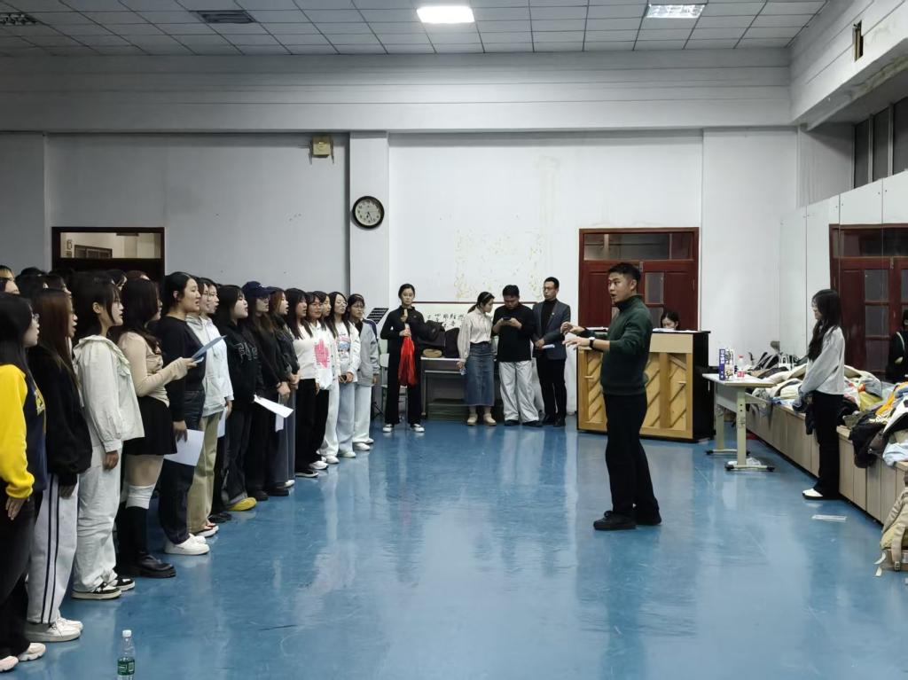 在一个多月的备赛过程中,合唱团成员们在院团委书记张鹏飞以及艺术学院专业教师林晨、姜华的悉心指导下,全情投入、刻苦训练。备赛初期,指导老师针对声部基础、气息控制、音准把握等核心要素进行系统教学,为合唱团打牢专业基础;中期训练中,老师们逐段分析曲目结构,从情绪渲染、节奏统一到声音层次的呈现进行逐一示范与纠正。进入赛前强化阶段,张鹏飞老师亲自把关整体效果,对每一次合唱进行细致点评,并对站位调整、眼神交流、舞台表现等细节提出针对性优化意见。在学院学生会文化活动部的统筹安排下,成员们充分利用课余时间持续练习,相互配合、不断磨合,用坚持与汗水诠释对艺术的追求,也用真挚情感表达对祖国的深沉热爱。