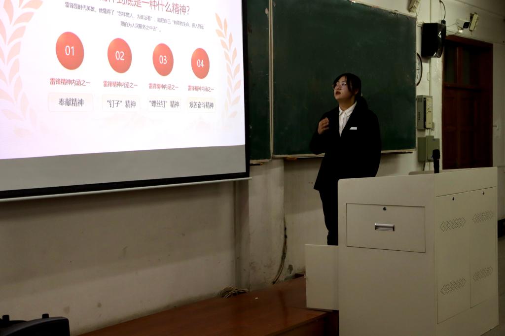 宣讲会上,赵子涵以“学习雷锋精神”为主题,围绕雷锋精神的内涵、为什么要学习雷锋精神以及当代青年人如何践行雷锋精神等三个方面,带领大家深入了解和认识了雷锋以及雷锋精神,通过分享雷锋同志的感人故事以及名言名句,激励学生骨干们学习雷锋坚定不移的“钉子精神”,把崇高理想信念和道德品质追求转化为具体行动,以高度的责任感、使命感投入到平凡的工作和生活中。她表示,如若全体学生骨干都能将学雷锋活动融入日常、化作经常,努力做一颗永不生锈的螺丝钉,经法学院学生工作的生命力、创造力、凝聚力、向心力将更加无比强大。