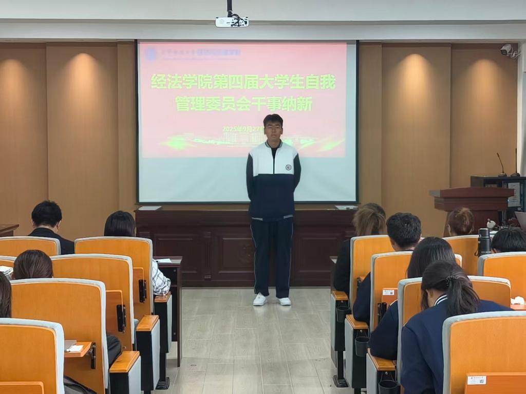 9月27日下午,经法学院于博识楼A402召开经法学院第四届大学生自我管理委员会(简称自管会)干事竞选会议。会议由经法学院自管会主席刘鑫喆主持,学院学办主任李路云出席会议,共有20名同学参与竞选。