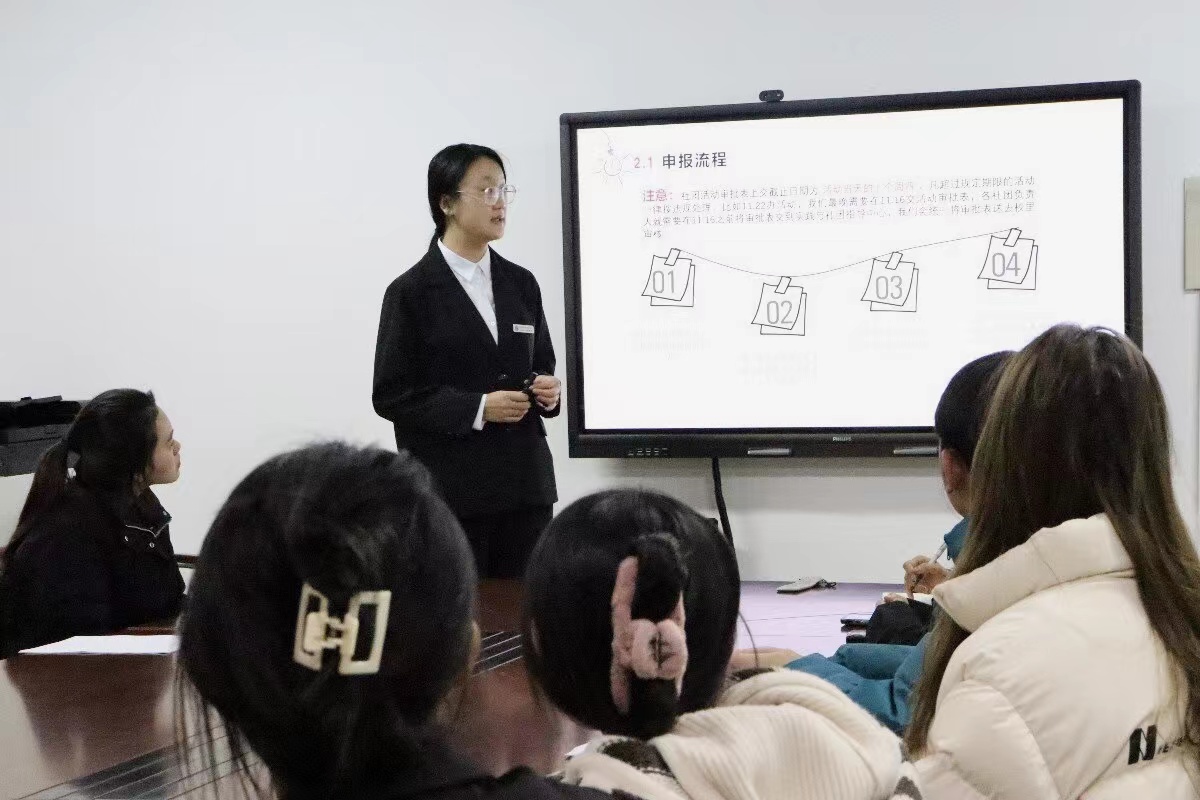 会上,学院分团委实践与社团指导中心工作人员刘新竹对本部门近期工作开展情况进行了说明。张诗晗琪从社团评优、社团活动申报流程、社团注册以及第二课堂加分等四个方面展开了详细介绍。她讲道,在社团评优方面共有“十佳学生社团”“优秀学生社团”“特色社团活动”“优秀社团干部”四个评选项目,并鼓励大家积极推动社团工作的有序开展,充分发挥学生社团的作用,努力做出成绩;在社团活动申报流程方面,张诗晗琪向大家详细讲述了完成活动审批表的四个步骤;在社团注册方面,她对资金申请、社团更名申请、社团条幅宣传申请、社团场地申请进行了详细讲解;她指出,第二课堂加分分别在学生思想成长、实践学习、创新创业、志愿公益、文体活动等方面进行加分。