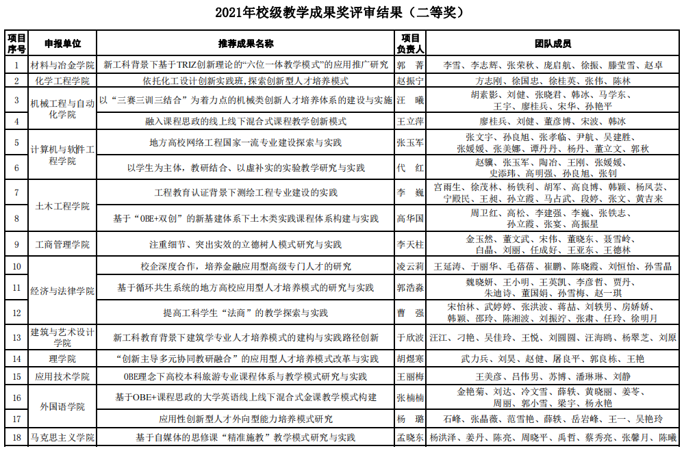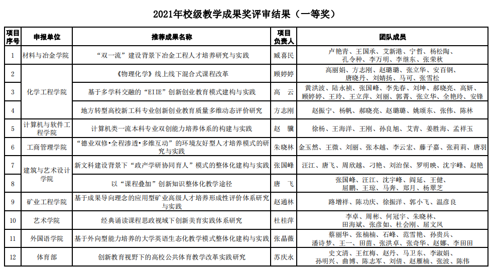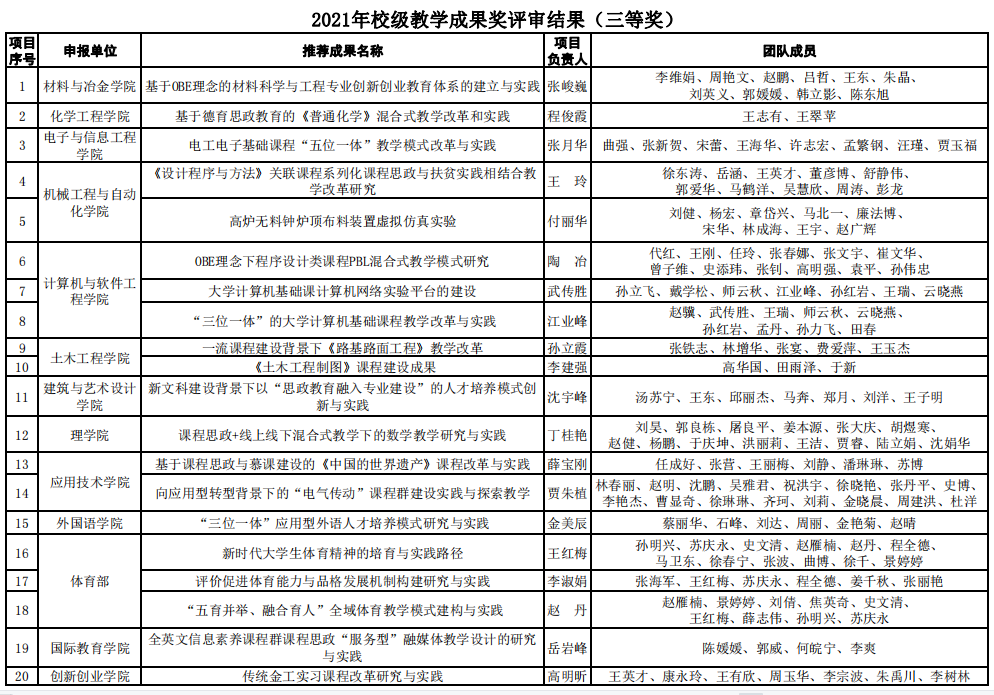 根据《关于开展FH体育(国际)官方网站2021年教学成果奖评选工作的通知》(FH SPORTS教发【2021】35号)相关工作安排,各教学单位推荐参评2021年校级教学成果奖共62项。经专家评审,学校研究决定2021年校级教学成果奖获奖项目为50项,其中一等奖12项,二等奖18项,三等奖20项。获奖名单公布如下: