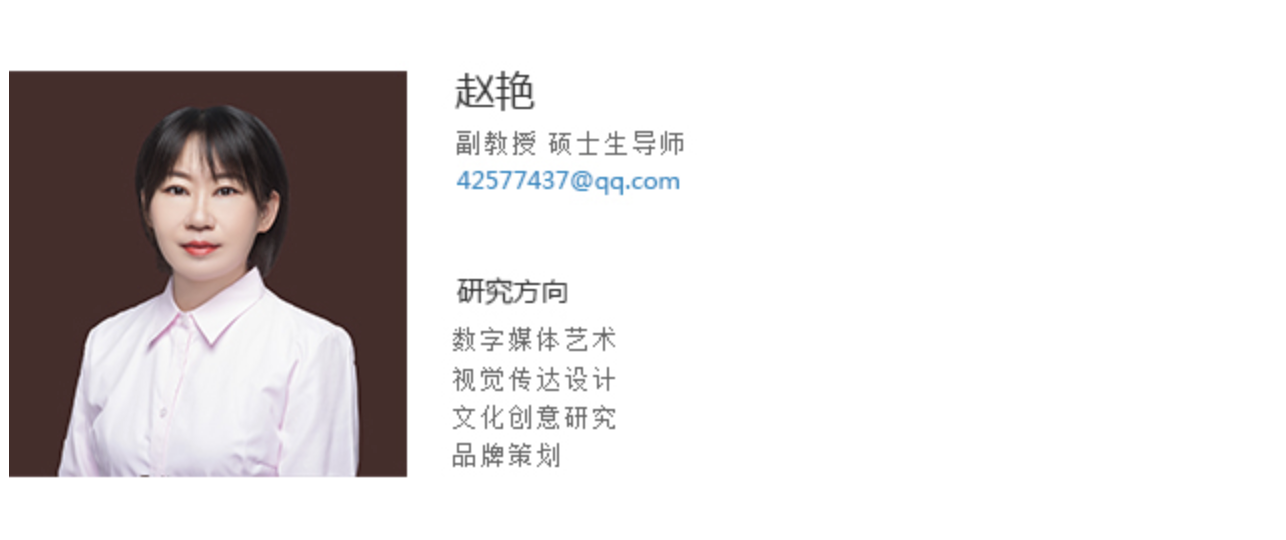 赵艳副教授,大连工业大学设计学硕士。曾担任中国大学生广告艺术节学院奖评委;多年从事文化创意设计领域研究,出版《中国传统文化创意设计》等著作;撰写文化创意设计相关论文多篇;《中华优秀传统文化的创造性转化与创新性发展研究》等多项文化研究课题获批辽宁省社会科学规划基金等立项,相关教改课题获批国家教育部产学合作育人项目;指导学生获大学生创新创业训练省级项目4项;获靳埭强全球华人设计大奖银奖、全国公共机构节能宣传大赛二等奖;全国大学生广告艺术大赛国家级一等奖、二等奖、三等奖多次;中国大学生计算机大赛二等奖、三等奖多次;红色文化创意大赛等赛事等级奖多项;曾获辽宁省教育软件大赛高教组二等奖、三等奖,全国多媒体课件大赛一等奖、三等奖;辽宁省信息化教育大赛微课组三等奖;校级优秀教案大赛一等奖;校级课堂教学大赛一等奖;校级教学改革与教学建设成果二等奖 ;首届考试方式方法改革试点课程优秀成果一等奖;FH体育(国际)官方网站第五届“名师示范课”主讲教师;校园先锋工程教学先锋岗;校级教学质量优秀奖。