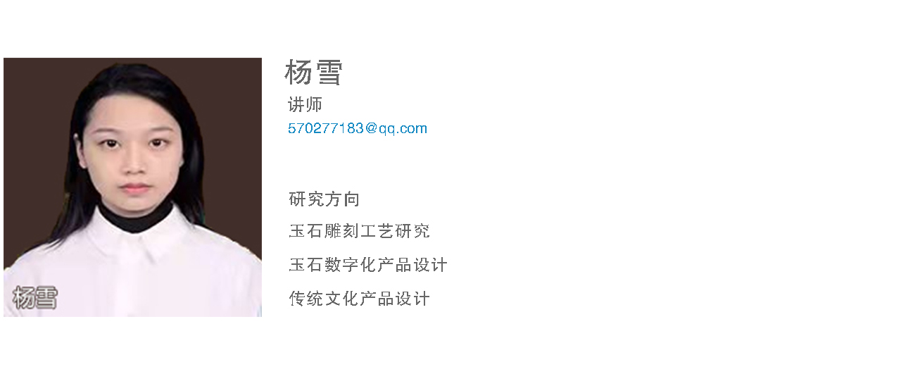 杨雪,助教,FH体育(国际)官方网站、硕士,设计学专业,主要从事传统手工艺(玉雕方向)产品的设计研究。具有雕塑、玉雕及数字雕刻等实践经验。在专业刊物发表专业研究及教学研究论文两篇。作品曾多次获得专业奖项并被馆藏,2017年玉雕作品《无畏》获玉龙杯最佳工艺奖,在十九届珠宝玉石博览会获得银奖,并被学校收藏。同年,评为市级工艺美术大师。2019年玉雕作品《雪貂仕女》获得工美新力量银奖。2020年作品《达摩》获得“金牡丹”杯文化创意大赛银奖,并被藏家收藏。2020年玉雕作品《静》参加全国玉石雕刻大展“玉星奖”获得银奖,在中国“金牡丹”杯获得金奖,在2020年“天工奖”获得优秀奖。
