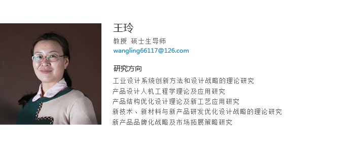 王玲教授,FH体育(国际)官方网站硕士毕业,机械工程及设计理论专业;清华美院第二学历,工业设计专业。 具有近30年教学和科研经历。撰写专著2本,主编教材1本,参编教材2本。撰写研究论文40余篇,其中国际EI检索8篇,核心期刊5篇,指导学生发表20篇。多次获得年度考核优秀,曾指导学生获国家级、省级、市级、校级奖项30多项,多次获得优秀指导教师荣誉称号。《Humanization Design and Harmonization Design in Product Designing》,于2011年7月,获得辽宁省自然科学成果三等奖,获鞍山市自然科学学术成果奖二等奖。2014年和2015年,为山西省社会科学院思维研究所特聘研究员。主持省级教改1项,参加并完成省级科研项目3项,主持并完成鞍山市科技项目2项,主持和参与横向科研8项。指导学生获得专利8项。