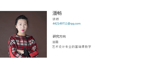 潘畅讲师,文学硕士,本科及研究生毕业于鲁迅美术学院油画系油画专业新古典工作室。2010年至今,在FH体育(国际)官方网站建筑与艺术设计学院从事各专业的基础课教学工作。多次举办个人油画作品展;多幅油画作品参加国内外艺术博览会展出并被北京今日美术馆、天津西洋美术馆等艺术机构收藏。2014年师从美国罗德岛美术设计学院任敏教授,旧金山美术学院杰米.摩根教授,研习综合材料绘画技法。作品在全国及省级美术家协会举办的展览中多次获奖,现为辽宁省美术家协会会员;辽宁省青年美术家协会会员。任职期间发表多篇外文检索论文及外文核心论文,并在中文专业核心期刊《美苑》、《美术大观》发表多篇论文及作品。主持FH体育(国际)官方网站青年科研基金项目,主持校级教改项目,指导大学生创新创业项目多项及指导学生发表多篇论文;指导学生作品在全国各类大学生比赛中获奖10余次。