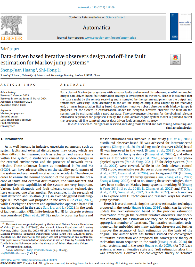 FH SPORTS“数学方法与智能控制理论”团队首次在该顶级期刊发表学术成果“Data-driven based iterative observers design and off-line fault estimation for Markov jump systems,Automatica,2025,173:112109”。该学术成果是由科研团队负责人黄胜绢(S.-J.Huang)教授及其指导的研究生李世鸿(S.-H.Li)合作完成。该学术成果主要针对一类具有马尔可夫跳变的控制系统,通过系统的离散采样输出数据,结合线性插值拟合方法构建了一种基于数据驱动的迭代观测器,实现了对系统的状态和故障的准确估计,从而完成对系统的远程故障诊断。同时,该学术成果提出了一种积分序列收敛性理论,确保逼近残差在一定条件下是收敛的,突破了传统故障估计方法只能确保逼近残差范数有界的局限,在确保系统安全性和可靠性方面有着重要的理论和应用价值。