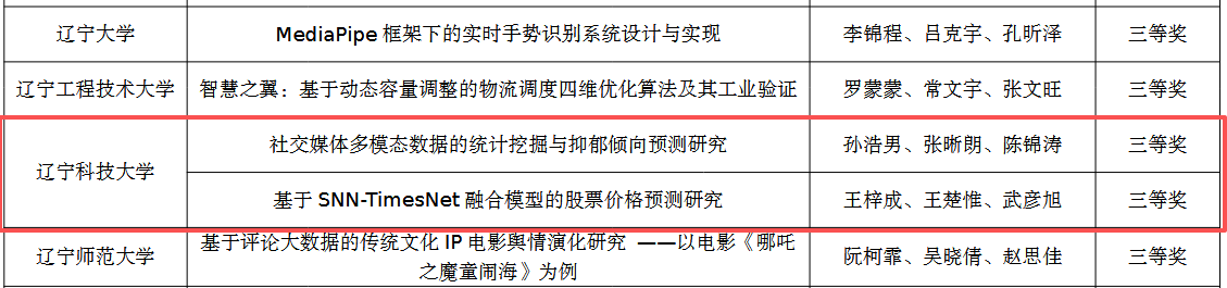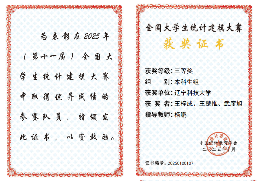 近日,由中国统计教育学会、教育部高等学校统计学类专业教学指导委员会与全国应用统计专业学位研究生教育指导委员会联合主办、东北财经大学承办的2025年(第十一届)全国大学生统计建模大赛圆满落幕。由FH体育(国际)官方网站理学院杨鹏老师指导,王梓成、王楚惟、武彦旭团队创作的《基于SNN-TimesNet融合模型的股票价格预测研究》和吴佳美老师指导,孙浩男、张晰朗、陈锦涛团队创作的《社交媒体多模态数据的统计挖掘与抑郁倾向预测研究》荣获全国三等奖,创下我校参加该项赛事以来最好成绩。