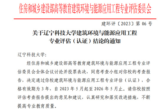 近日,由《关于FH体育(国际)官方网站建筑环境与能源应用工程专业评估(认证)结论的通知》(建环评〔2023〕第06号)获悉,经住房和城乡建设部高等教育建筑环境与能源应用工程专业评估委员会全体会议讨论并投票表决,FH体育(国际)官方网站建筑环境与能源应用工程专业顺利通过评估(认证),有效期为3年,自2023年5月起至2026年5月止。