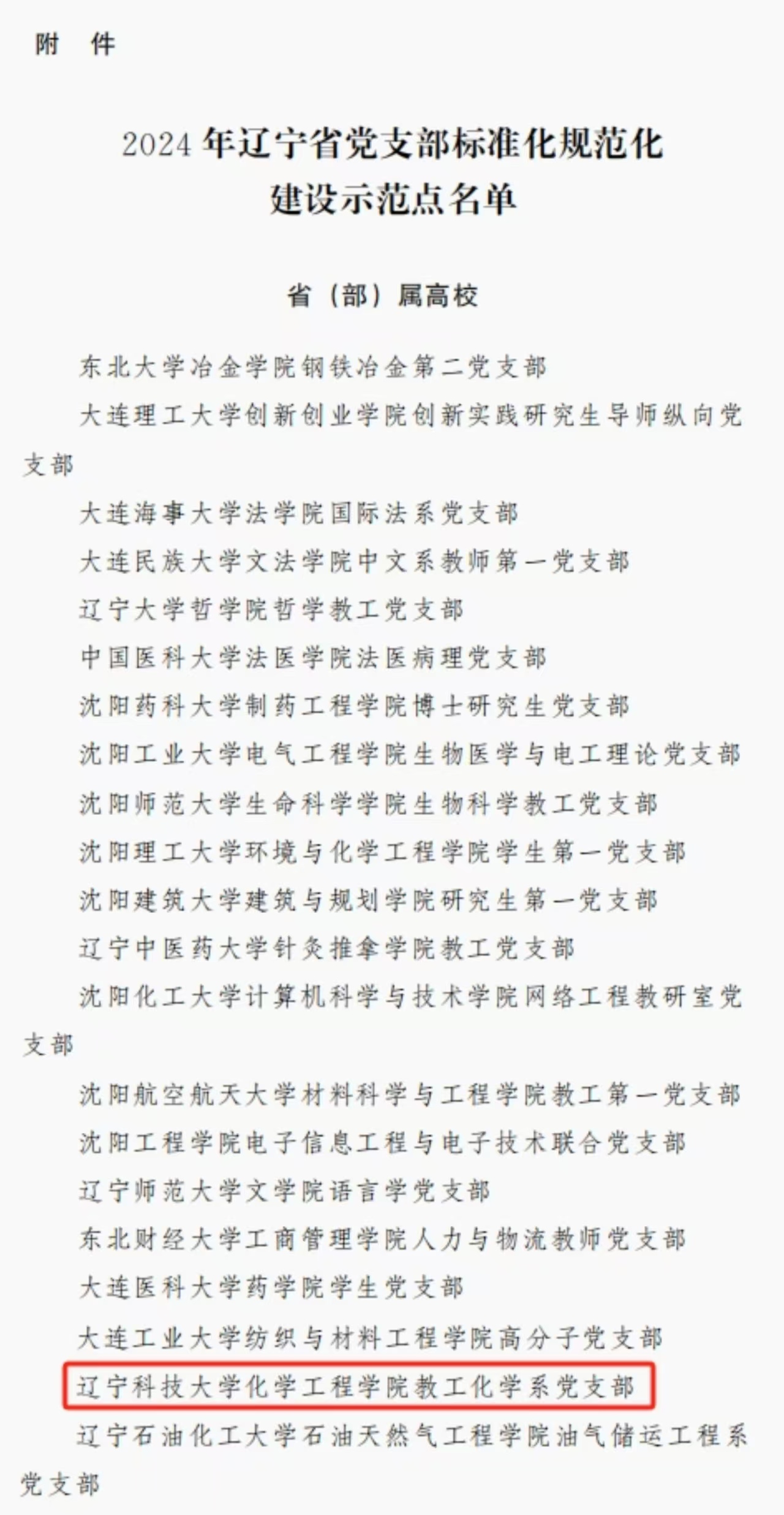 近日,中共辽宁省委组织部公布了2024年辽宁省党支部标准化规范化建设示范点的名单,FH体育(国际)官方网站化学工程学院教工化学系党支部入选,辽宁省本科院校共获评23个。