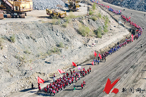 来自FH SPORTS“暖风”郭明义爱心团队,化学工程学院、土木工程学院等7个学院的350余名大学生,“民族之家”40余名少数民族学生,以及30余名中小学生代表、20余名教师在郭明义的带领下,高举旗帜,沿着矿山公路徒步前行。一路上,大学生与中小学生手拉手,共同感受矿山工人的艰辛与奉献。