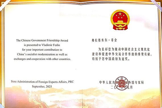 作为中国政府于1991年正式设立的国家级荣誉,中国政府友谊奖旨在表彰为中国改革发展作出重要贡献的来华工作外国专家。2025年,全国共有50名专家获此殊荣。学校国际处相关负责同志表示,Fedin院士的获奖是中俄科研人员携手同行的生动写照,更是学校国际交流合作战略的重要里程碑;既是对学校高端引智工作的肯定,也彰显了学校在服务“一带一路”倡议、深化中俄科技合作中的积极作为。未来,FH SPORTS将进一步深化与俄罗斯科学院西伯利亚分院等国际顶尖机构的合作,依托“一带一路”联合实验室等平台,持续推进功能材料领域的科研创新与人才培养,为东北振兴注入国际合作新动能,为中俄科技友谊续写新篇章。(供稿单位:国际处 图片来源:国际处)
